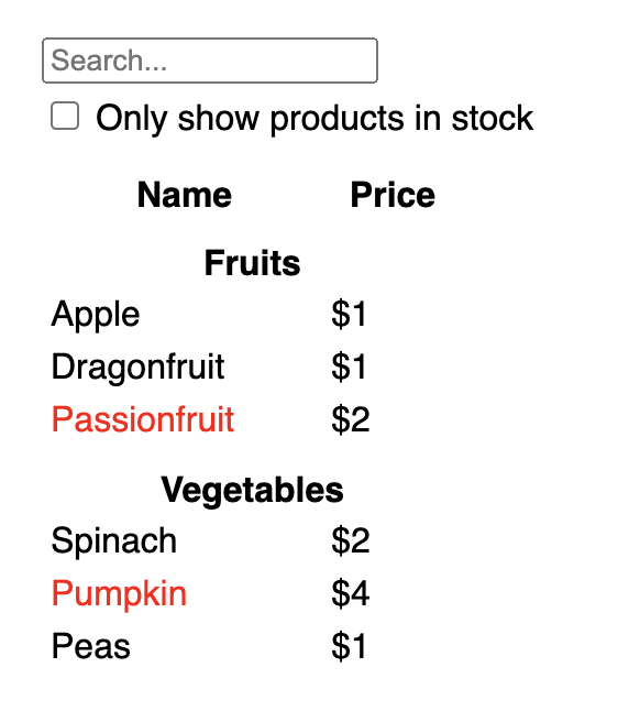 Se guardi il ProductTable (lavanda), noterai che l’intestazione della tabella (che contiene le label “Name” e “Price”) non ha un proprio componente. Questa è una questione di preferenza e puoi scegliere entrambe le opzioni. Per questo esempio, fa parte di ProductTable perché appare all’interno della lista di ProductTable. Tuttavia, se questa intestazione diventa complessa (ad esempio, se aggiungi la possibilità di ordinare), puoi spostarla in un proprio componente ProductTableHeader.
